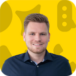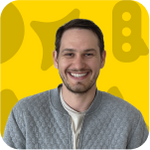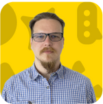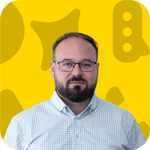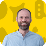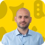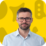 Portrét muže s krátkými hnědými vlasy, bradkou a brýlemi, oblečeného v bílé košili s jemným vzorem. Má neutrální výraz a dívá se přímo do kamery. Pozadí je žluté s abstraktními tvary